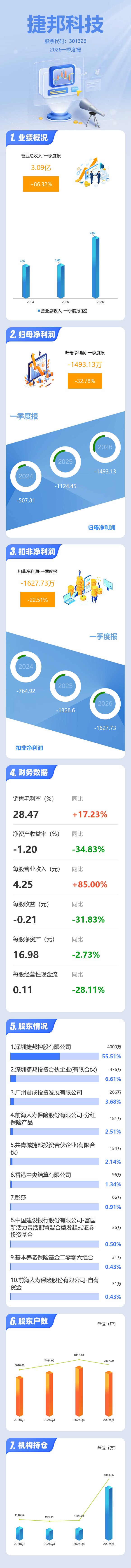 证券之星消息,捷邦科技2026年一季报显示,一季度公司主营收入3.09亿元,同比上升86.33%;归母净利润-1493.13万元,同比下降32.79%;扣非净利润-1627.73万元,同比下降22.51%;负债率46.18%,投资收益-12.39万元,财务费用1014.59万元,毛利率28.47%。