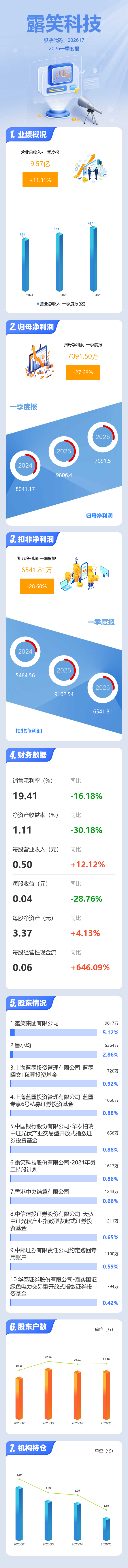 证券之星消息,露笑科技2026年一季报显示,一季度公司主营收入9.57亿元,同比上升11.32%;归母净利润7091.5万元,同比下降27.68%;扣非净利润6541.81万元,同比下降28.6%;负债率39.1%,投资收益20.02万元,财务费用2569.63万元,毛利率19.41%。