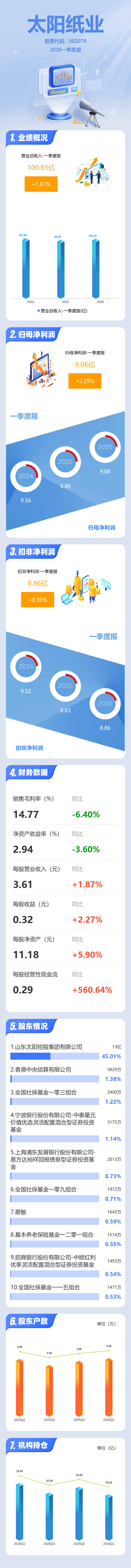 证券之星消息,太阳纸业2026年一季报显示,一季度公司主营收入100.83亿元,同比上升1.87%;归母净利润9.06亿元,同比上升2.29%;扣非净利润8.86亿元,同比上升0.35%;负债率47.67%,投资收益453.33万元,财务费用8820.53万元,毛利率14.77%。