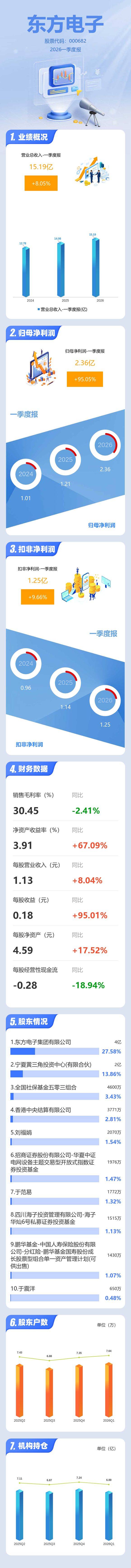 证券之星消息,东方电子2026年一季报显示,一季度公司主营收入15.19亿元,同比上升8.05%;归母净利润2.36亿元,同比上升95.06%;扣非净利润1.25亿元,同比上升9.66%;负债率52.81%,投资收益67.73万元,财务费用-1246.09万元,毛利率30.45%。