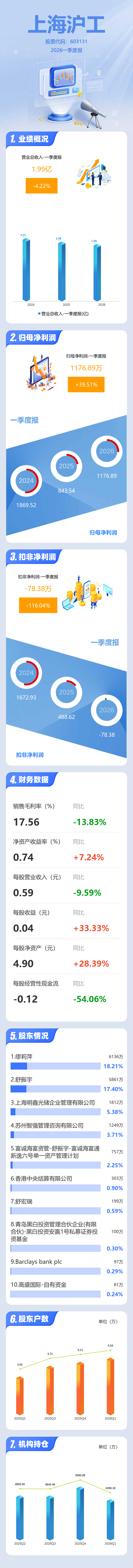证券之星消息,上海沪工2026年一季报显示,一季度公司主营收入1.99亿元,同比下降4.23%;归母净利润1176.89万元,同比上升39.52%;扣非净利润-78.38万元,同比下降116.04%;负债率20.61%,投资收益845.7万元,财务费用586.38万元,毛利率17.56%。