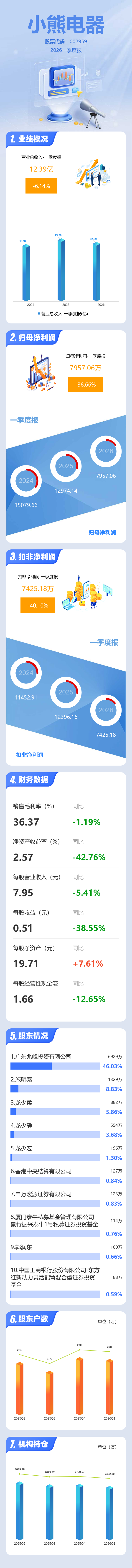 证券之星消息,小熊电器2026年一季报显示,一季度公司主营收入12.39亿元,同比下降6.14%;归母净利润7957.06万元,同比下降38.67%;扣非净利润7425.18万元,同比下降40.1%;负债率45.47%,投资收益113.89万元,财务费用880.23万元,毛利率36.37%。
