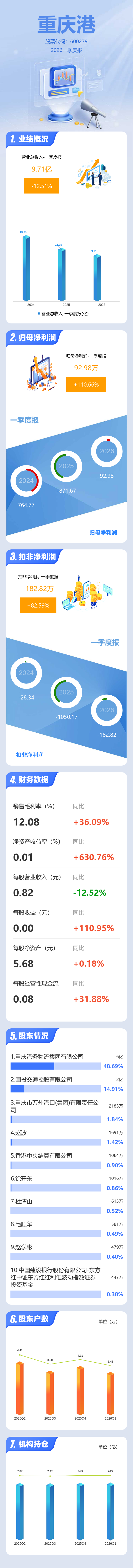证券之星消息,重庆港2026年一季报显示,一季度公司主营收入9.71亿元,同比下降12.52%;归母净利润92.98万元,同比上升110.67%;扣非净利润-182.82万元,同比上升82.59%;负债率36.94%,投资收益-47.37万元,财务费用1984.45万元,毛利率12.08%。