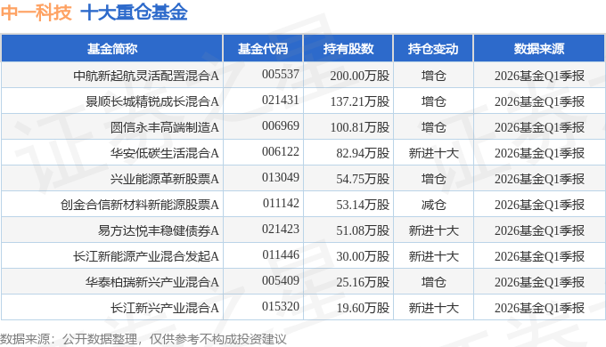 持有中一科技最多的基金为中航新起航灵活配置混合A,目前规模为0.9亿元,最新净值0.9356(4月28日),较上一交易日下跌1.35%,近一年上涨84.68%。该基金现任基金经理为韩浩。