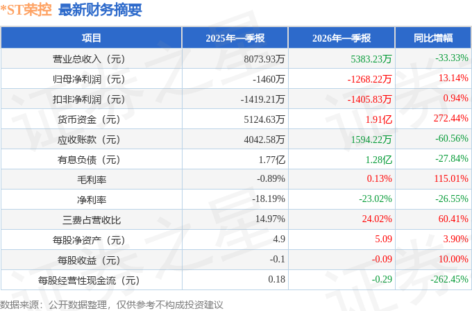 据证券之星公开数据整理,近期*ST荣控(000668)发布2026年一季报。截至本报告期末,公司营业总收入5383.23万元,同比下降33.33%,归母净利润-1268.22万元,同比上升13.14%。按单季度数据看,第一季度营业总收入5383.23万元,同比下降33.33%,第一季度归母净利润-1268.22万元,同比上升13.14%。本报告期*ST荣控三费占比上升明显,财务费用、销售费用和管理费用总和占总营收同比增幅达60.41%。