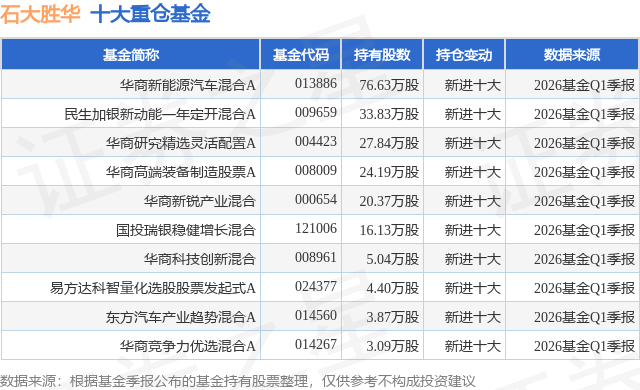 根据2026基金Q1季报公募基金重仓股数据,重仓该股的公募基金共16家,其中持有数量最多的公募基金为华商基金的华商新能源汽车混合A。华商新能源汽车混合A目前规模为5.54亿元,最新净值0.7825(4月28日),较上一交易日下跌1.15%,近一年上涨43.65%。该公募基金现任基金经理为陈夏琼。陈夏琼在任的基金产品包括:华商高端装备制造股票A,管理时间为2025年1月6日至今,期间收益率为190.62%;华商竞争力优选混合A,管理时间为2025年1月6日至今,期间收益率为110.46%;