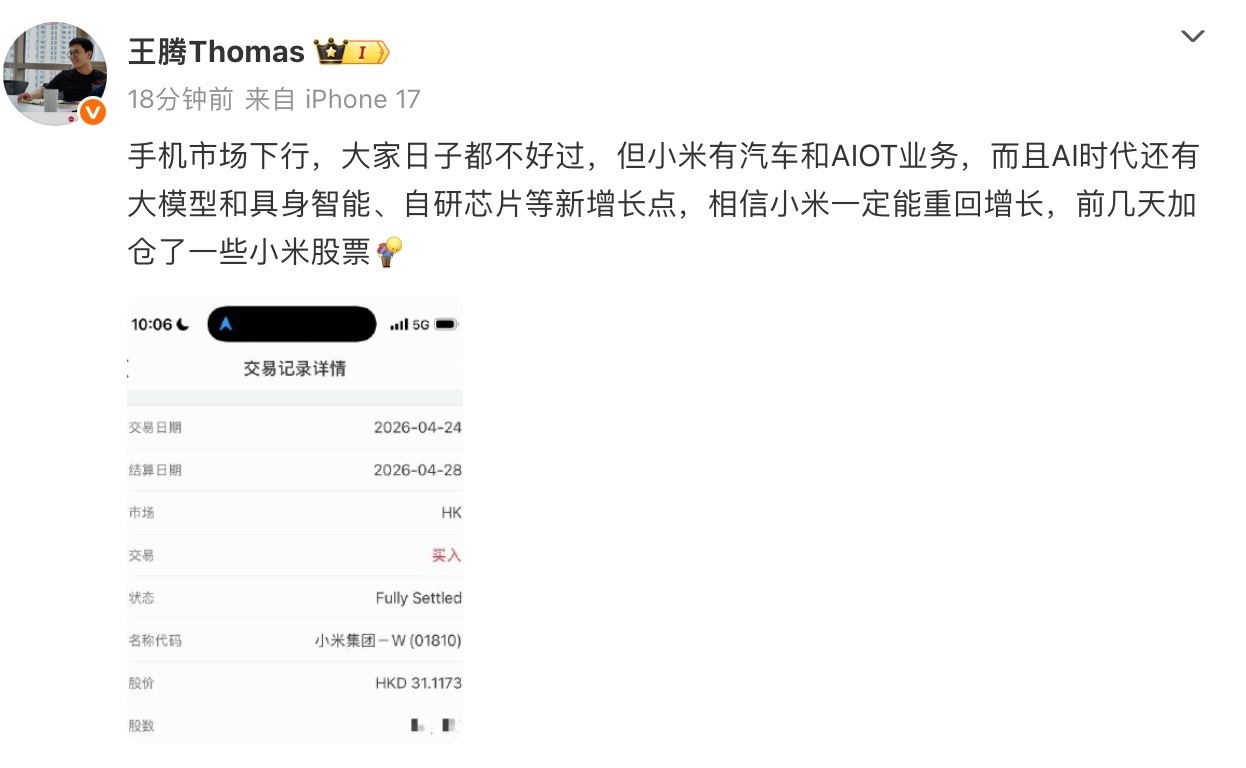 凤凰网科技讯 4月30日,王腾发文表示:手机市场下行,大家日子都不好过,但小米有汽车和AIOT业务,而且AI时代还有大模型和具身智能、自研芯片等新增长点,相信小米一定能重回增长,前几天加仓了一些小米股票。稍早前,王腾就“一加、realme合并”的消息发文称,这是市场下行情况合理的选择,优化资源配置。“受上游成本涨价的影响,手机市场短期很难有增长,今年各大手机厂基本都在做人员优化。”