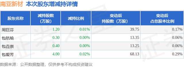 证券之星消息,4月29日南亚新材发布公告《南亚新材:关于持股5%以上股东权益变动触及1%刻度的提示性公告》,其股东周巨芬、包航榆、包垚崇、包爱芳于2026年4月29日合计减持5.9万股,占公司目前总股本的0.0251%,变动期间该股股价上涨1.36%,截止4月29日收盘报175.1元。