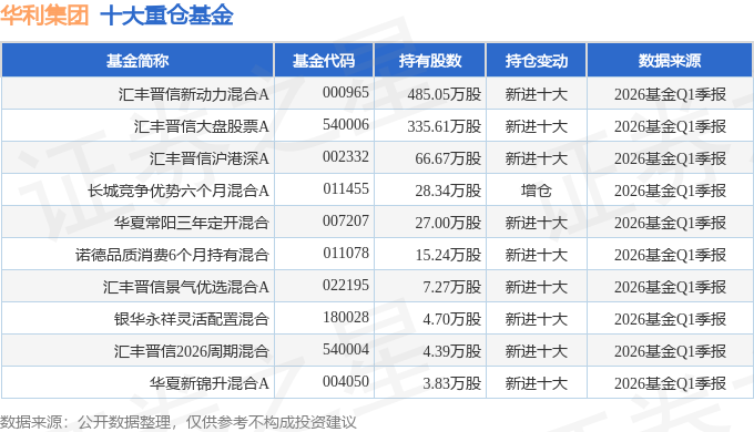 持有华利集团最多的基金为汇丰晋信新动力混合A,目前规模为25.86亿元,最新净值2.3257(4月29日),较上一交易日上涨1.12%,近一年上涨42.77%。该基金现任基金经理为闵良超。