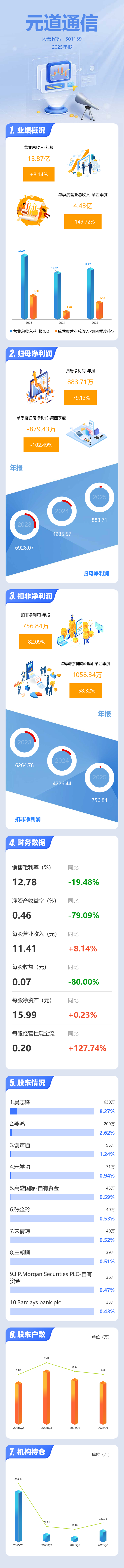 证券之星消息,元道通信2025年年报显示,当年度公司主营收入13.87亿元,同比上升8.14%;归母净利润883.71万元,同比下降79.14%;扣非净利润756.84万元,同比下降82.09%;其中2025年第四季度,公司单季度主营收入4.43亿元,同比上升149.72%;单季度归母净利润-879.43万元,同比下降102.5%;单季度扣非净利润-1058.34万元,同比下降58.32%;负债率35.93%,投资收益-343.34万元,财务费用3262.06万元,毛利率12.78%。