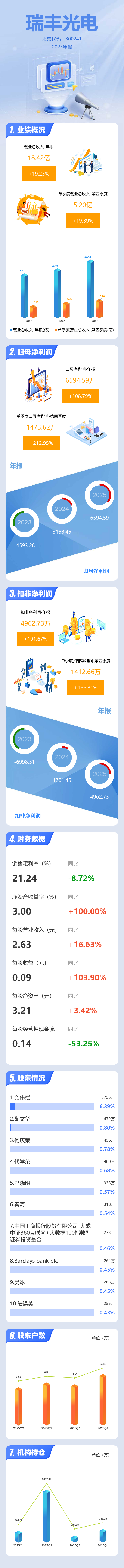 证券之星消息,瑞丰光电2025年年报显示,当年度公司主营收入18.42亿元,同比上升19.24%;归母净利润6594.59万元,同比上升108.79%;扣非净利润4962.73万元,同比上升191.68%;其中2025年第四季度,公司单季度主营收入5.2亿元,同比上升19.4%;单季度归母净利润1473.62万元,同比上升212.96%;单季度扣非净利润1412.66万元,同比上升166.82%;负债率39.12%,投资收益859.39万元,财务费用355.5万元,毛利率21.24%。
