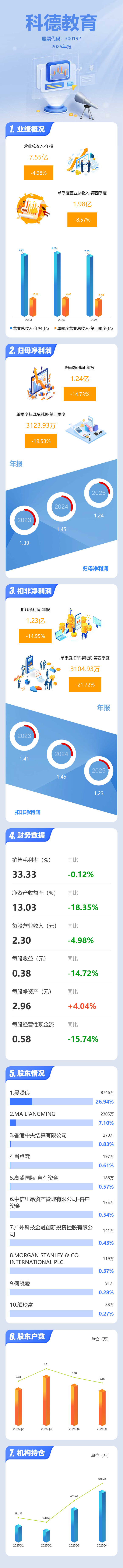 证券之星消息,科德教育2025年年报显示,当年度公司主营收入7.55亿元,同比下降4.99%;归母净利润1.24亿元,同比下降14.73%;扣非净利润1.23亿元,同比下降14.95%;其中2025年第四季度,公司单季度主营收入1.98亿元,同比下降8.58%;单季度归母净利润3123.93万元,同比下降19.53%;单季度扣非净利润3104.93万元,同比下降21.72%;负债率25.01%,投资收益576.01万元,财务费用33.59万元,毛利率33.33%。
