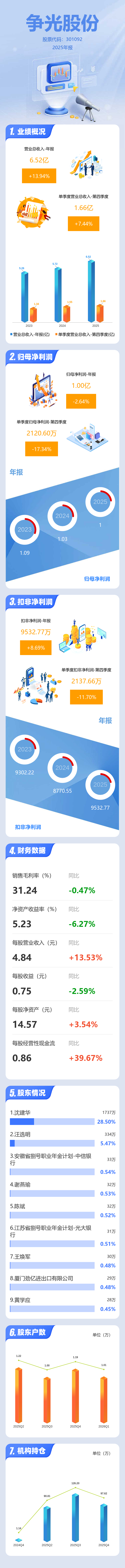 证券之星消息,争光股份2025年年报显示,当年度公司主营收入6.52亿元,同比上升13.94%;归母净利润1.0亿元,同比下降2.64%;扣非净利润9532.77万元,同比上升8.69%;其中2025年第四季度,公司单季度主营收入1.66亿元,同比上升7.45%;单季度归母净利润2120.6万元,同比下降17.35%;单季度扣非净利润2137.66万元,同比下降11.7%;负债率10.6%,投资收益375.89万元,财务费用-1105.0万元,毛利率31.24%。