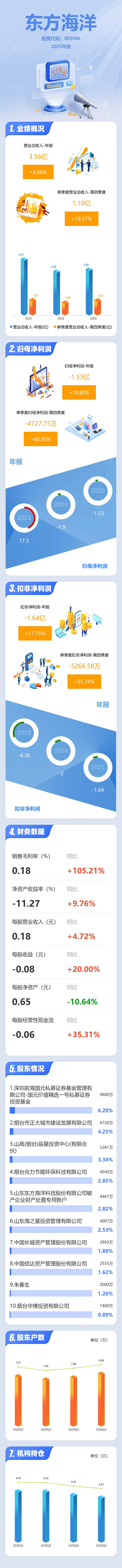 证券之星消息,东方海洋2025年年报显示,当年度公司主营收入3.56亿元,同比上升4.68%;归母净利润-1.53亿元,同比上升19.8%;扣非净利润-1.64亿元,同比上升17.76%;其中2025年第四季度,公司单季度主营收入1.1亿元,同比上升19.37%;单季度归母净利润-4727.75万元,同比上升60.85%;单季度扣非净利润-5266.58万元,同比上升55.74%;负债率20.39%,投资收益14.21万元,财务费用455.64万元,毛利率0.18%。