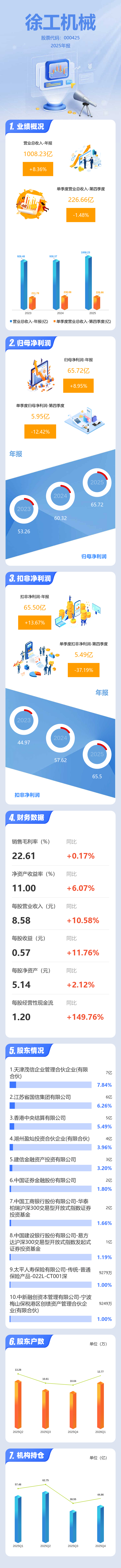 证券之星消息,徐工机械2025年年报显示,当年度公司主营收入1008.23亿元,同比上升8.37%;归母净利润65.72亿元,同比上升8.96%;扣非净利润65.5亿元,同比上升13.68%;其中2025年第四季度,公司单季度主营收入226.66亿元,同比下降1.49%;单季度归母净利润5.95亿元,同比下降12.42%;单季度扣非净利润5.49亿元,同比下降37.19%;负债率64.01%,投资收益-2.37亿元,财务费用7.16亿元,毛利率22.61%。