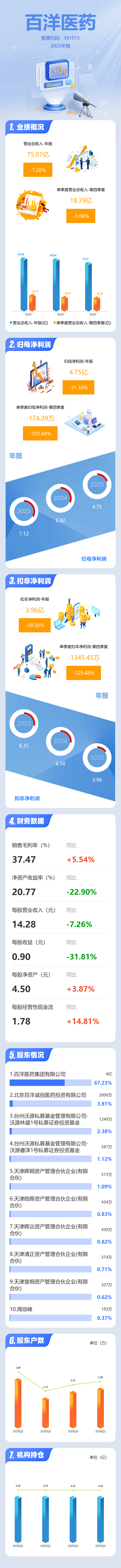 证券之星消息,百洋医药2025年年报显示,当年度公司主营收入75.07亿元,同比下降7.26%;归母净利润4.75亿元,同比下降31.36%;扣非净利润3.96亿元,同比下降39.59%;其中2025年第四季度,公司单季度主营收入18.79亿元,同比下降3.65%;单季度归母净利润-174.39万元,同比下降103.45%;单季度扣非净利润-1345.45万元,同比下降129.48%;负债率66.2%,投资收益1959.74万元,财务费用1.08亿元,毛利率37.47%。