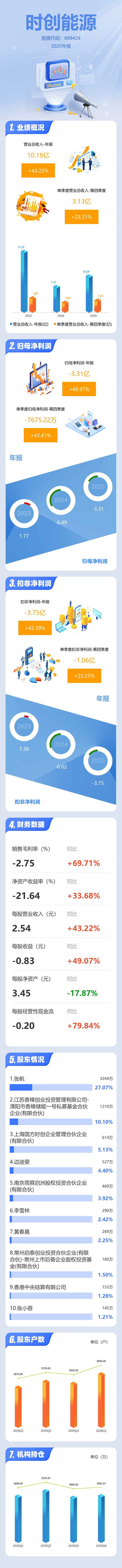 证券之星消息,时创能源2025年年报显示,当年度公司主营收入10.18亿元,同比上升43.23%;归母净利润-3.31亿元,同比上升48.97%;扣非净利润-3.75亿元,同比上升43.4%;其中2025年第四季度,公司单季度主营收入3.13亿元,同比上升23.31%;单季度归母净利润-7675.22万元,同比上升43.41%;单季度扣非净利润-1.06亿元,同比上升23.23%;负债率70.36%,投资收益334.77万元,财务费用8538.22万元,毛利率-2.75%。