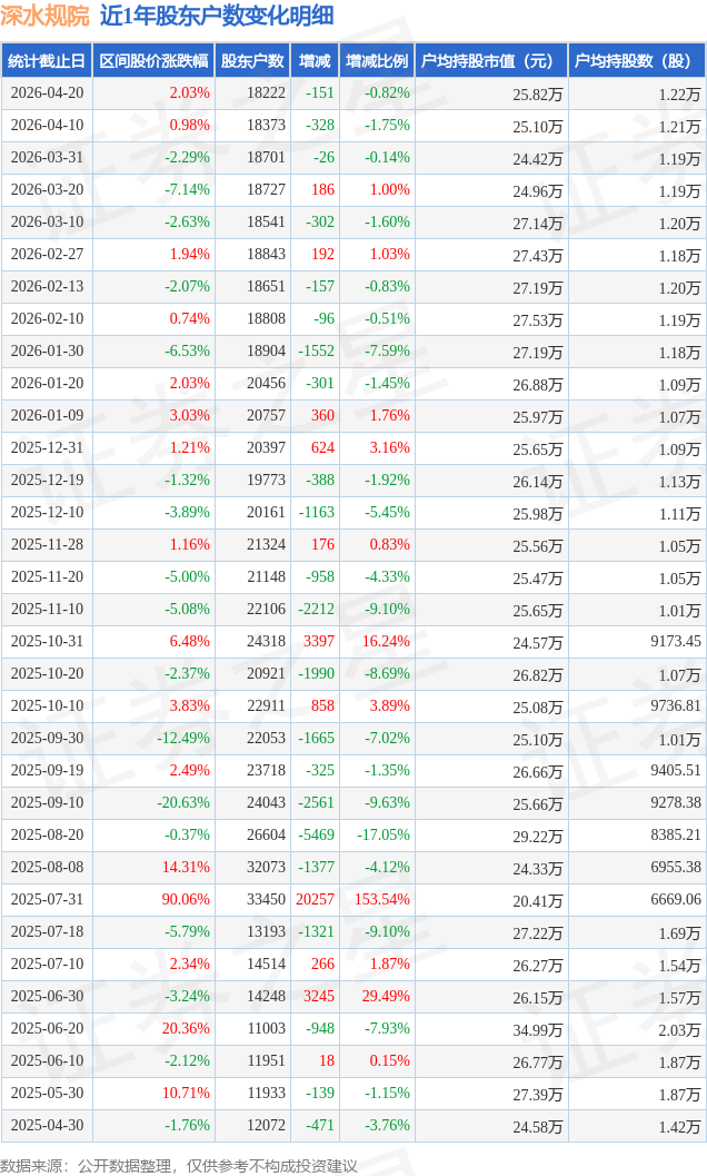 证券之星消息,近日深水规院披露,截至2026年4月20日公司股东户数为1.82万户,较4月10日减少151.0户,减幅为0.82%。户均持股数量由上期的1.21万股增加至1.22万股,户均持股市值为25.82万元。