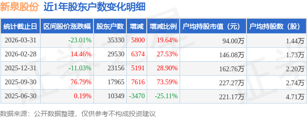 从股价来看,2026年2月28日至2026年3月31日,新泉股份区间跌幅为23.01%,在此期间股东户数增加5800.0户,增幅为19.64%。