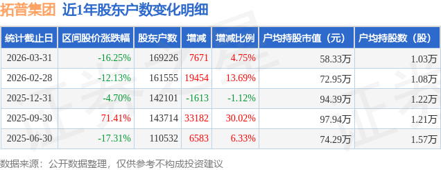 证券之星消息,近日拓普集团披露,截至2026年3月31日公司股东户数为16.92万户,较2月28日增加7671.0户,增幅为4.75%。户均持股数量由上期的1.08万股减少至1.03万股,户均持股市值为58.33万元。