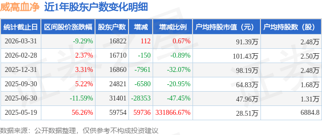 从股价来看,2026年2月28日至2026年3月31日,威高血净区间跌幅为9.29%,在此期间股东户数增加112.0户,增幅为0.67%。