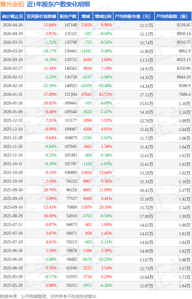 从股价来看,2026年4月10日至2026年4月20日,豫光金铅区间涨幅为12.84%,在此期间股东户数增加1.2万户,增幅为8.9%。