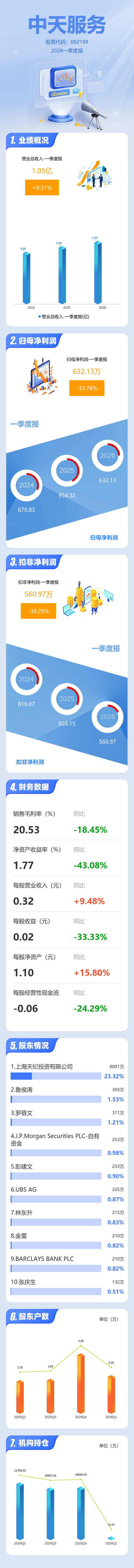 证券之星消息,中天服务2026年一季报显示,一季度公司主营收入1.05亿元,同比上升9.51%;归母净利润632.13万元,同比下降33.76%;扣非净利润560.97万元,同比下降39.3%;负债率38.26%,投资收益21.78万元,财务费用22.53万元,毛利率20.53%。