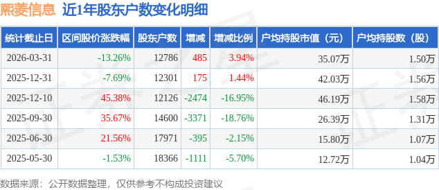 从股价来看,2025年12月31日至2026年3月31日,熙菱信息区间跌幅为13.26%,在此期间股东户数增加485.0户,增幅为3.94%。