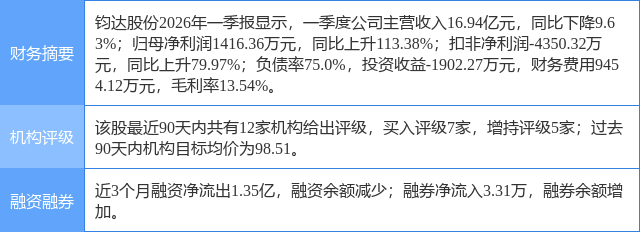2026年4月20日,国金证券研究员姚遥发布了对钧达股份的研报《以高层战略为引、全球化为矛,剑指航天业务新版图》,该研报对钧达股份给出“买入”评级。证券之星数据中心根据近三年发布的研报数据计算,该研报作者对此股的盈利预测准确度为31.78%。