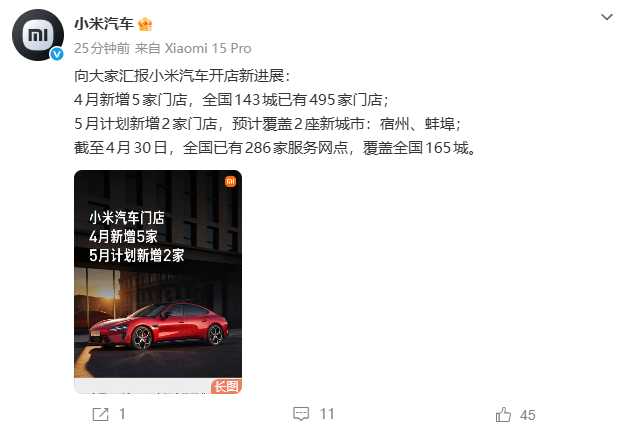 凤凰网科技讯(作者/许婧)4月30日,小米汽车官方今日公布了4月门店拓展情况:全月新增5家门店,覆盖城市达143座,累计门店数已达495家。预计5月将新增2家门店,落地安徽宿州与蚌埠两座新城市。截至4月30日,小米汽车全国服务网点已达286家,覆盖165座城市。