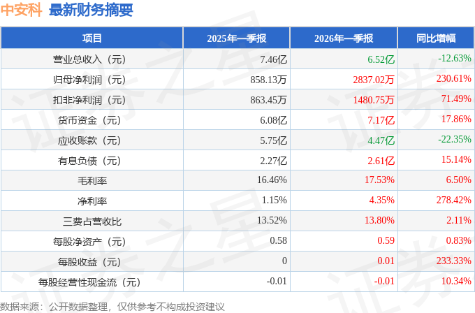 据证券之星公开数据整理,近期中安科(600654)发布2026年一季报。截至本报告期末,公司营业总收入6.52亿元,同比下降12.63%,归母净利润2837.02万元,同比上升230.61%。按单季度数据看,第一季度营业总收入6.52亿元,同比下降12.63%,第一季度归母净利润2837.02万元,同比上升230.61%。本报告期中安科盈利能力上升,毛利率同比增幅6.5%,净利率同比增幅278.42%。