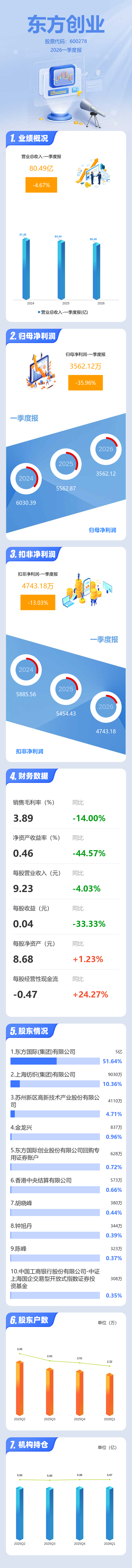 证券之星消息,东方创业2026年一季报显示,一季度公司主营收入80.49亿元,同比下降4.68%;归母净利润3562.12万元,同比下降35.97%;扣非净利润4743.18万元,同比下降13.04%;负债率57.63%,投资收益720.09万元,财务费用-590.15万元,毛利率3.89%。