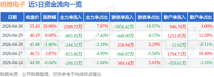 4月30日的资金流向数据方面,主力资金净流入2509.72万元,占总成交额7.97%,游资资金净流出3456.42万元,占总成交额10.97%,散户资金净流入946.7万元,占总成交额3.0%。