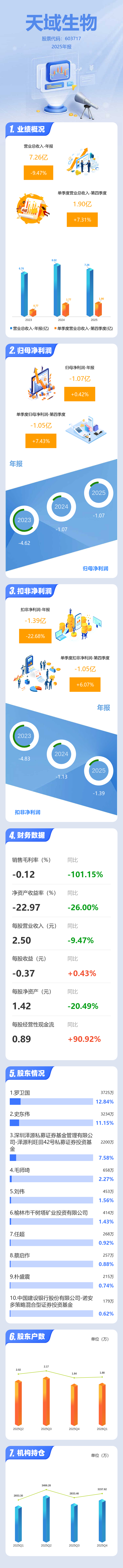 证券之星消息,天域生物2025年年报显示,当年度公司主营收入7.26亿元,同比下降9.47%;归母净利润-1.07亿元,同比上升0.42%;扣非净利润-1.39亿元,同比下降22.69%;其中2025年第四季度,公司单季度主营收入1.9亿元,同比上升7.32%;单季度归母净利润-1.05亿元,同比上升7.43%;单季度扣非净利润-1.05亿元,同比上升6.08%;负债率79.48%,投资收益-411.45万元,财务费用906.41万元,毛利率-0.12%。