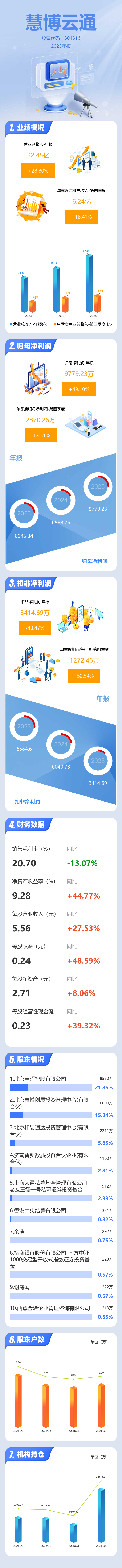 证券之星消息,慧博云通2025年年报显示,当年度公司主营收入22.45亿元,同比上升28.8%;归母净利润9779.23万元,同比上升49.1%;扣非净利润3414.69万元,同比下降43.47%;其中2025年第四季度,公司单季度主营收入6.24亿元,同比上升16.41%;单季度归母净利润2370.26万元,同比下降13.52%;单季度扣非净利润1272.46万元,同比下降52.55%;负债率38.25%,投资收益4691.9万元,财务费用1060.38万元,毛利率20.7%。