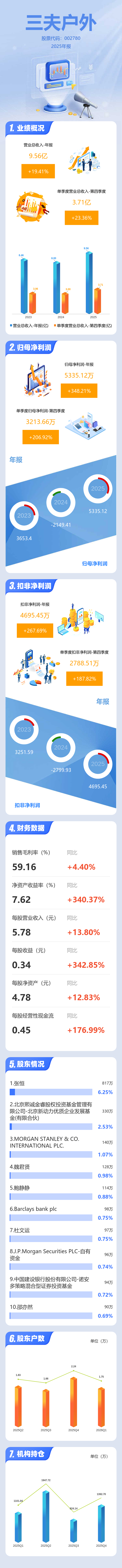 证券之星消息,三夫户外2025年年报显示,当年度公司主营收入9.56亿元,同比上升19.41%;归母净利润5335.12万元,同比上升348.21%;扣非净利润4695.45万元,同比上升267.7%;其中2025年第四季度,公司单季度主营收入3.71亿元,同比上升23.37%;单季度归母净利润3213.66万元,同比上升206.92%;单季度扣非净利润2788.51万元,同比上升187.83%;负债率39.73%,投资收益2037.34万元,财务费用1764.63万元,毛利率59.16%。
