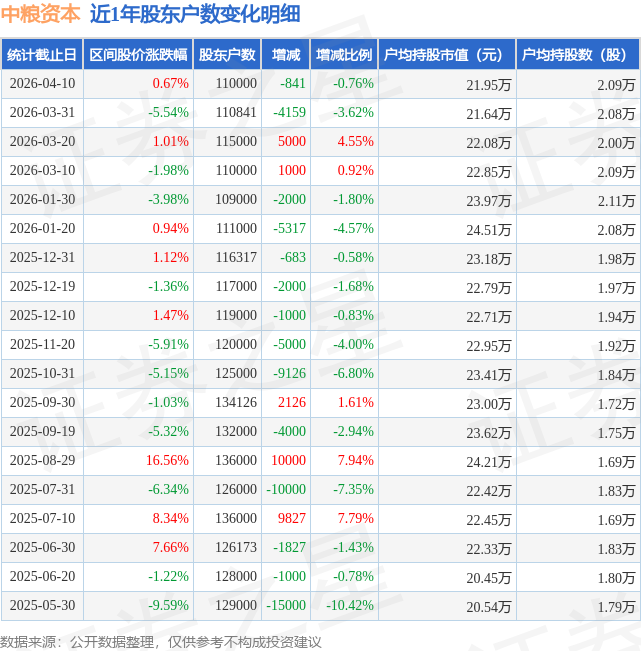 从股价来看,2026年3月31日至2026年4月10日,中粮资本区间涨幅为0.67%,在此期间股东户数减少841.0户,减幅为0.76%。