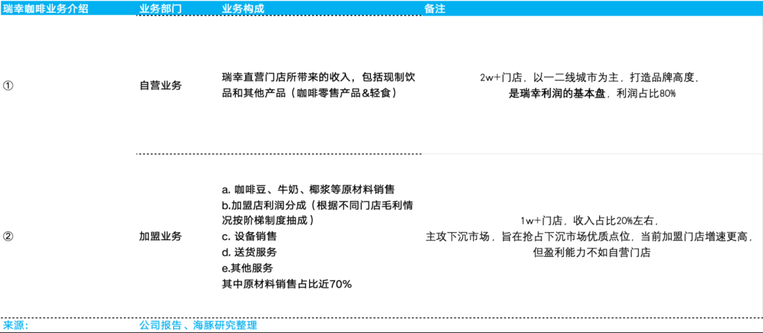 根据瑞幸咖啡披露口径,公司分为自营业务、加盟业务两大业务条线。