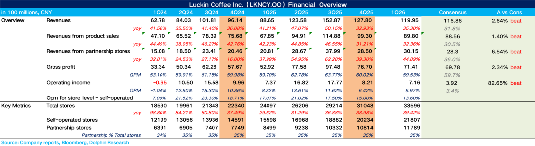 1、整体业绩小超预期。1Q26瑞幸实现总营收120亿元,同比增长35.3%,小超市场预期,增长主要由门店数量扩张和月均交易用户增长驱动,而非同店的内生增长。