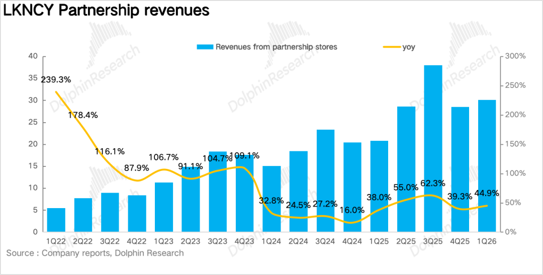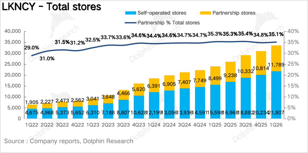 Q1瑞幸实现总营收120亿元,同比增长35.3%,小超市场预期。拆分业务来看,自营门店实现营收90亿元,同比增长32.3%,加盟业务收入30.2亿元,同比增长44.5%,增速快于自营门店的增长,核心在于瑞幸系统性降低了加盟门槛,通过加盟模式加速下沉抢占点位。
