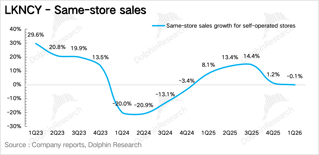 作为剔除新店影响后体现瑞幸单店内生增长的核心指标同店营业额增速(SSSG)同比下滑0.1%,呈现出非常明显的“补贴退潮——增速回落”的路径,拆分来看: