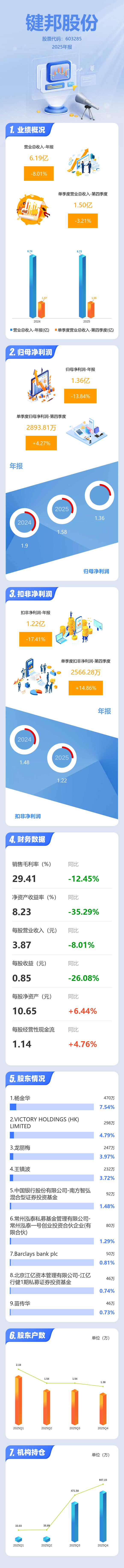 证券之星消息,键邦股份2025年年报显示,当年度公司主营收入6.19亿元,同比下降8.01%;归母净利润1.36亿元,同比下降13.84%;扣非净利润1.22亿元,同比下降17.41%;其中2025年第四季度,公司单季度主营收入1.5亿元,同比下降3.21%;单季度归母净利润2893.81万元,同比上升4.28%;单季度扣非净利润2566.28万元,同比上升14.87%;负债率8.27%,投资收益790.08万元,财务费用-502.68万元,毛利率29.41%。