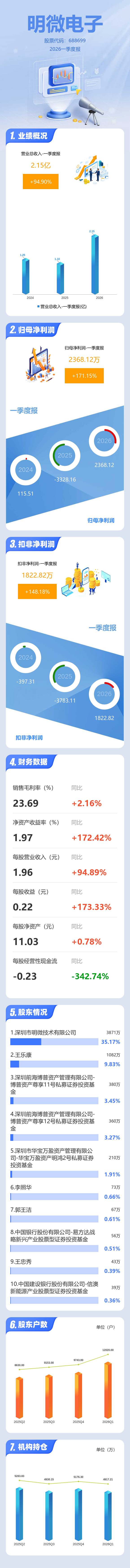 证券之星消息,明微电子2026年一季报显示,一季度公司主营收入2.15亿元,同比上升94.91%;归母净利润2368.12万元,同比上升171.15%;扣非净利润1822.82万元,同比上升148.18%;负债率27.24%,投资收益316.94万元,财务费用124.09万元,毛利率23.69%。