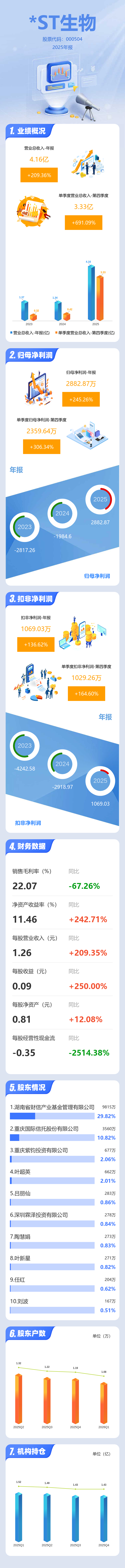 证券之星消息,*ST生物2025年年报显示,当年度公司主营收入4.16亿元,同比上升209.37%;归母净利润2882.87万元,同比上升245.26%;扣非净利润1069.03万元,同比上升136.62%;其中2025年第四季度,公司单季度主营收入3.33亿元,同比上升691.09%;单季度归母净利润2359.64万元,同比上升306.35%;单季度扣非净利润1029.26万元,同比上升164.61%;负债率63.95%,投资收益787.43万元,财务费用170.29万元,毛利率22.07%。