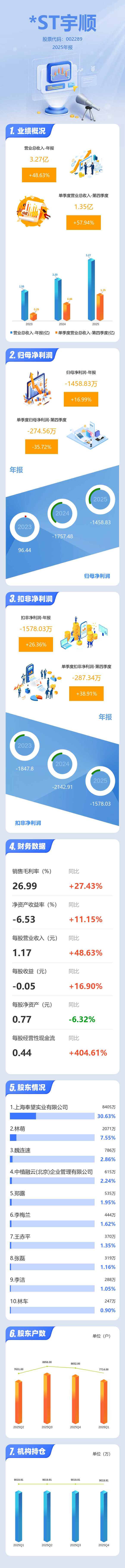 证券之星消息,*ST宇顺2025年年报显示,当年度公司主营收入3.27亿元,同比上升48.64%;归母净利润-1458.83万元,同比上升16.99%;扣非净利润-1578.03万元,同比上升26.36%;其中2025年第四季度,公司单季度主营收入1.35亿元,同比上升57.94%;单季度归母净利润-274.56万元,同比下降35.72%;单季度扣非净利润-287.34万元,同比上升38.91%;负债率95.75%,财务费用1474.95万元,毛利率26.99%。