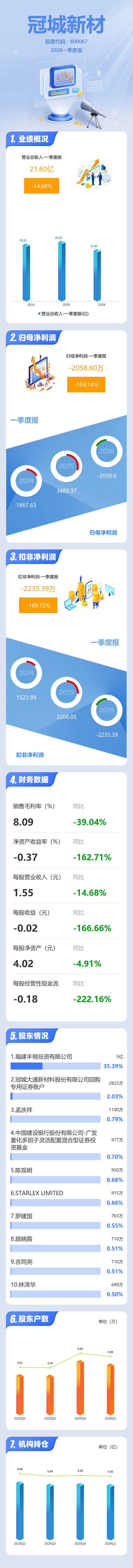 证券之星消息,冠城新材2026年一季报显示,一季度公司主营收入21.6亿元,同比下降14.68%;归母净利润-2058.6万元,同比下降159.15%;扣非净利润-2235.39万元,同比下降169.72%;负债率58.8%,投资收益-41.88万元,财务费用3452.74万元,毛利率8.09%。