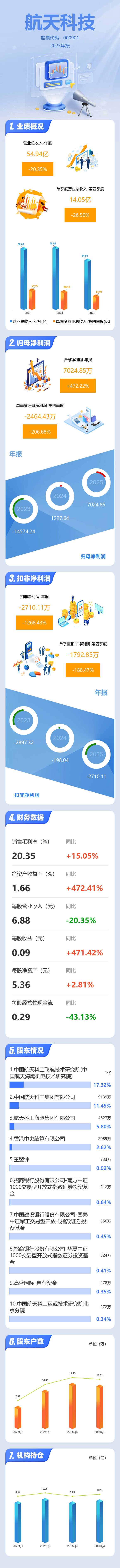 证券之星消息,航天科技2025年年报显示,当年度公司主营收入54.94亿元,同比下降20.35%;归母净利润7024.85万元,同比上升472.22%;扣非净利润-2710.11万元,同比下降1268.43%;其中2025年第四季度,公司单季度主营收入14.05亿元,同比下降26.5%;单季度归母净利润-2464.43万元,同比下降206.69%;单季度扣非净利润-1792.85万元,同比下降188.47%;负债率35.64%,投资收益1.21亿元,财务费用4212.14万元,毛利率20.35%。
