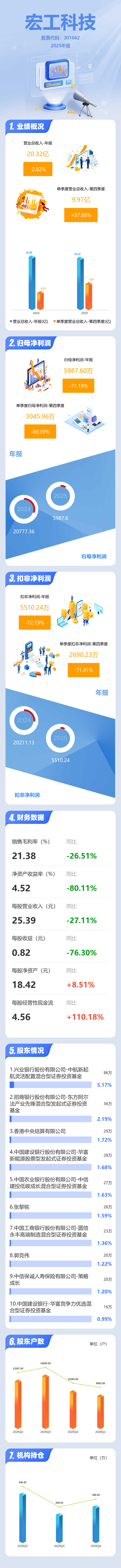 证券之星消息,宏工科技2025年年报显示,当年度公司主营收入20.32亿元,同比下降2.82%;归母净利润5987.6万元,同比下降71.18%;扣非净利润5510.24万元,同比下降72.74%;其中2025年第四季度,公司单季度主营收入9.97亿元,同比上升57.88%;单季度归母净利润3045.96万元,同比下降68.39%;单季度扣非净利润2690.23万元,同比下降71.42%;负债率68.37%,投资收益223.12万元,财务费用1325.42万元,毛利率21.38%。