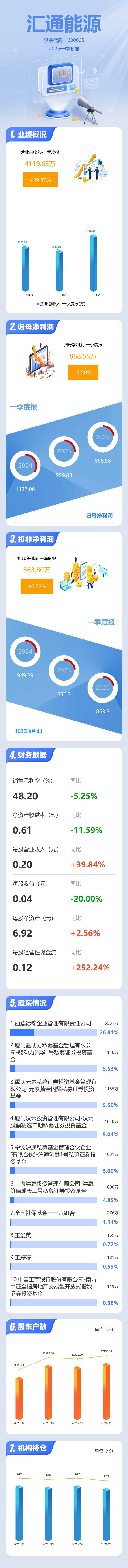 证券之星消息,汇通能源2026年一季报显示,一季度公司主营收入4119.63万元,同比上升39.88%;归母净利润868.58万元,同比下降9.51%;扣非净利润863.8万元,同比上升0.83%;负债率5.94%,投资收益301.89万元,财务费用-204.17万元,毛利率48.2%。