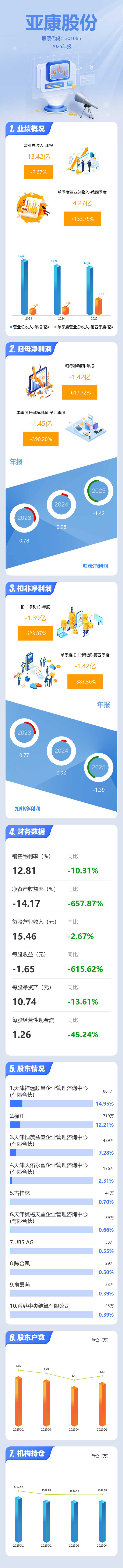 证券之星消息,亚康股份2025年年报显示,当年度公司主营收入13.42亿元,同比下降2.68%;归母净利润-1.42亿元,同比下降617.72%;扣非净利润-1.39亿元,同比下降623.87%;其中2025年第四季度,公司单季度主营收入4.27亿元,同比上升133.8%;单季度归母净利润-1.45亿元,同比下降390.2%;单季度扣非净利润-1.42亿元,同比下降383.56%;负债率44.48%,投资收益-30.31万元,财务费用1945.97万元,毛利率12.81%。